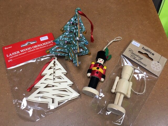 Wooden ornaments (Nutcracker soldiers £2.50) (3-D Christmas trees £1.70)