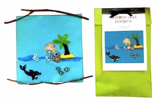 Contents: felt square (with sticks sewed on), fish buttons, ‘rock’ buttons, iron on mermaid motif, iron on dolphin motif, palm tree, felt ‘island’, thread & needle